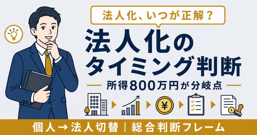 個人事業主の法人化タイミングは、売上1,000万円(消費税課税・インボイス)・利益800万円(税率逆転点)・社会保険加入・事業承継の4軸で総合判断します。法人化のメリットは税率の平準化・役員報酬による所得分散・消費税2年免税・赤字繰越10年・信用力向上が挙げられますが、赤字でも法人住民税7万円が発生する点、社会保険料負担、事務作業の増加といったデメリットも含めて判断が必要です。設立は株式会社か合同会社を選択し、定款作成・登記・各種届出を経て、個人事業の廃業届と事業引継を行います。移行後は税率・赤字繰越期間・消費税・社会保険が一気に変わるため、税理士との連携と中長期的な資金計画が成功の鍵となります。
